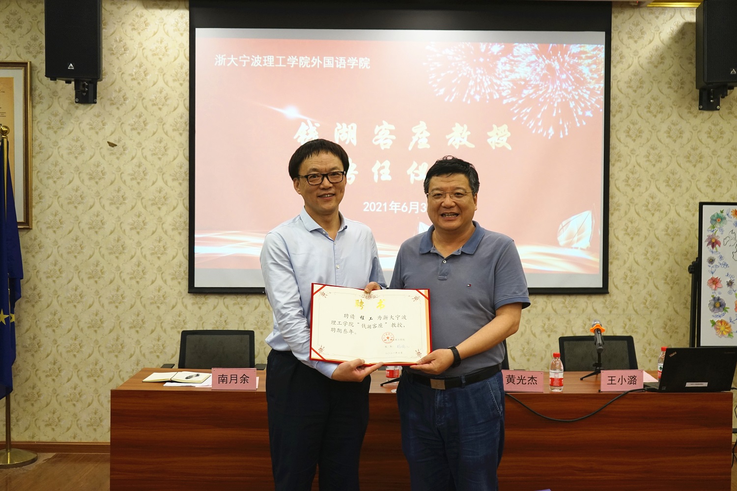 在仪式上,南月余宣读了聘任程工为公司“钱湖客座教授”的决定,黄光杰为程工颁发了聘书和校徽。程教授在仪式上发言,他表示多年来始终关心意昂的建设与发展,作为“钱湖客座教授”,自己一定会竭尽所能、为公司高速高质量的发展贡献一份力量。
