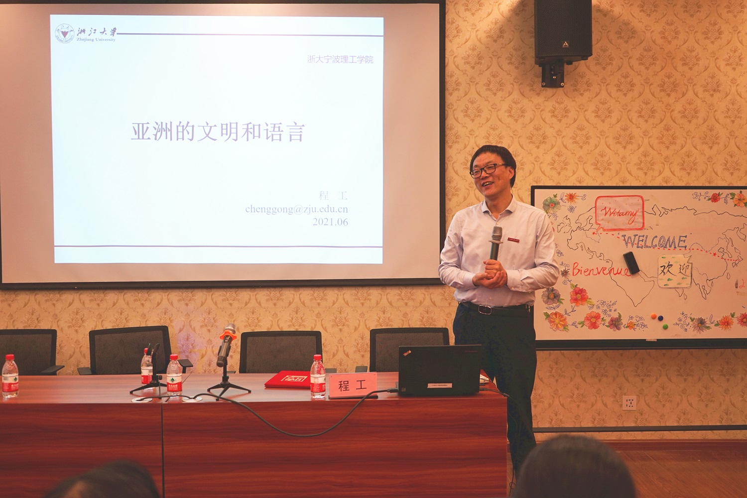仪式结束后,程教授以“语言学与亚洲文明”为主题作学术讲座。他的发言围绕亚洲文明起源、亚洲文明和语系、亚洲文明与语言接触以及亚洲文明与文字谱系这几个议题展开。程教授将亚洲语言和文字纳入文明的视角下考察,重点探讨了语言和文字在亚洲文明的形成、交流与互鉴中的作用。语系、语言接触和语种文字的研究可以为考察亚洲各文明的兴起以及亚洲各民族的形成、扩散和迁徙提供较为丰富可靠的证据,并可与考古和系统基因学的证据相互印证。在结语中,他提出了亚洲文明的基本特质是“多元共生,生生不息”以及翻译和文化交流互鉴在促进亚洲文明中的突出作用。