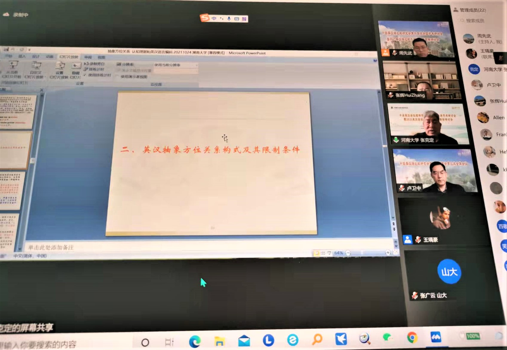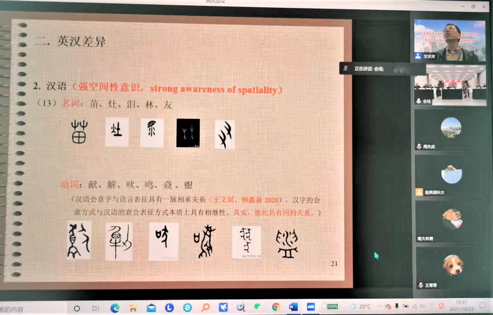 2021年10月22-24日,意昂周先武博士应邀在线参与中国英汉语比较研究会第十四次全国学术研讨会暨2021英汉语比较与翻译研究国际研讨会,在“语言认知研究”第二分会场担任分会场主持人,并作题为“汉英实体范畴隐喻和转喻型概念合成的语义复合模式对比研究”的学术交流。