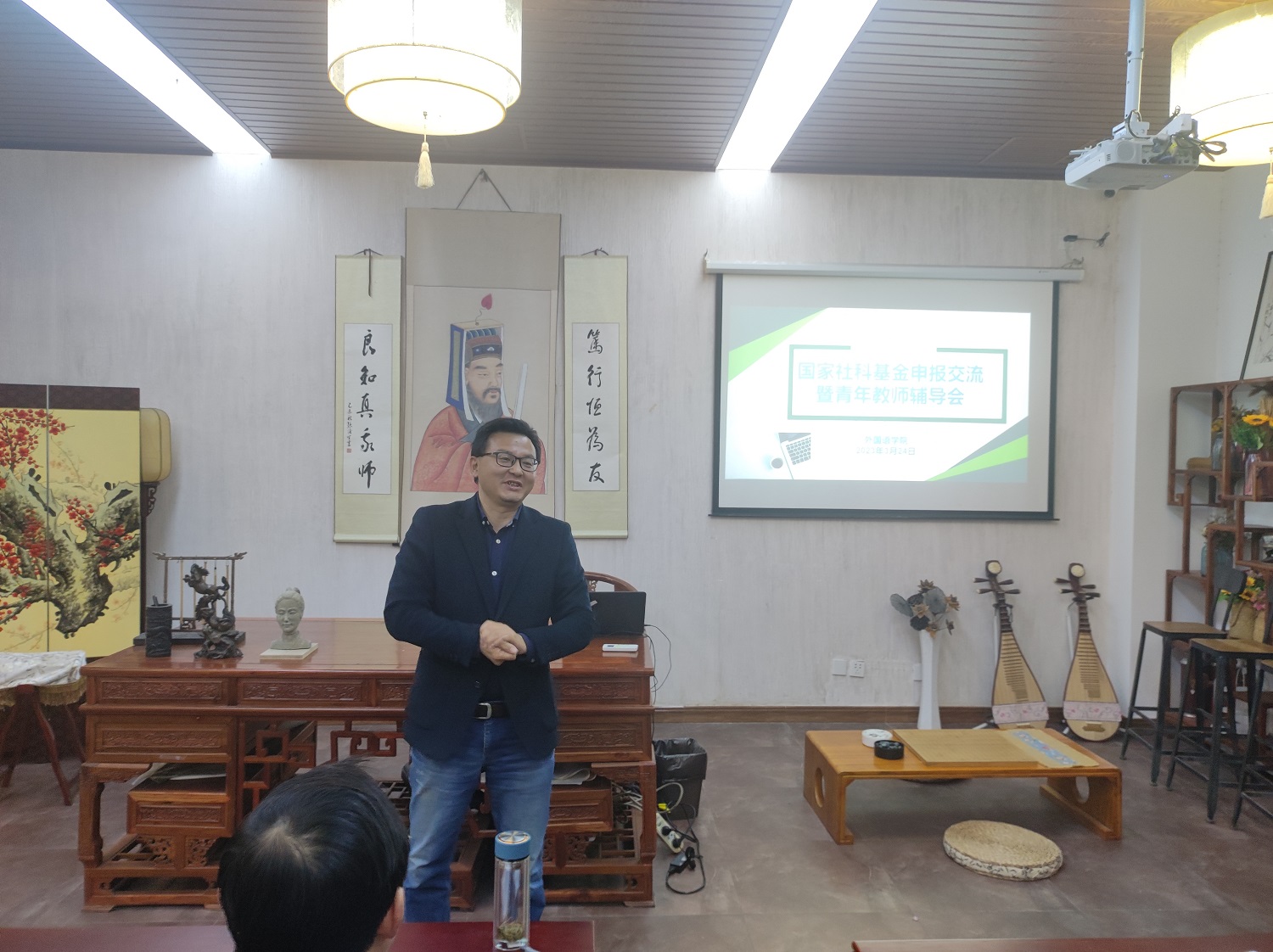 在交流会中,查德华和王欢两位老师也分享了2023年国社科申报的选题以及结合自己当前的研究方向而进行的研究工作。蔡亮、周先武从选题视角、学术梳理和内容框架等方面对他们分享内容进行了细致指导。