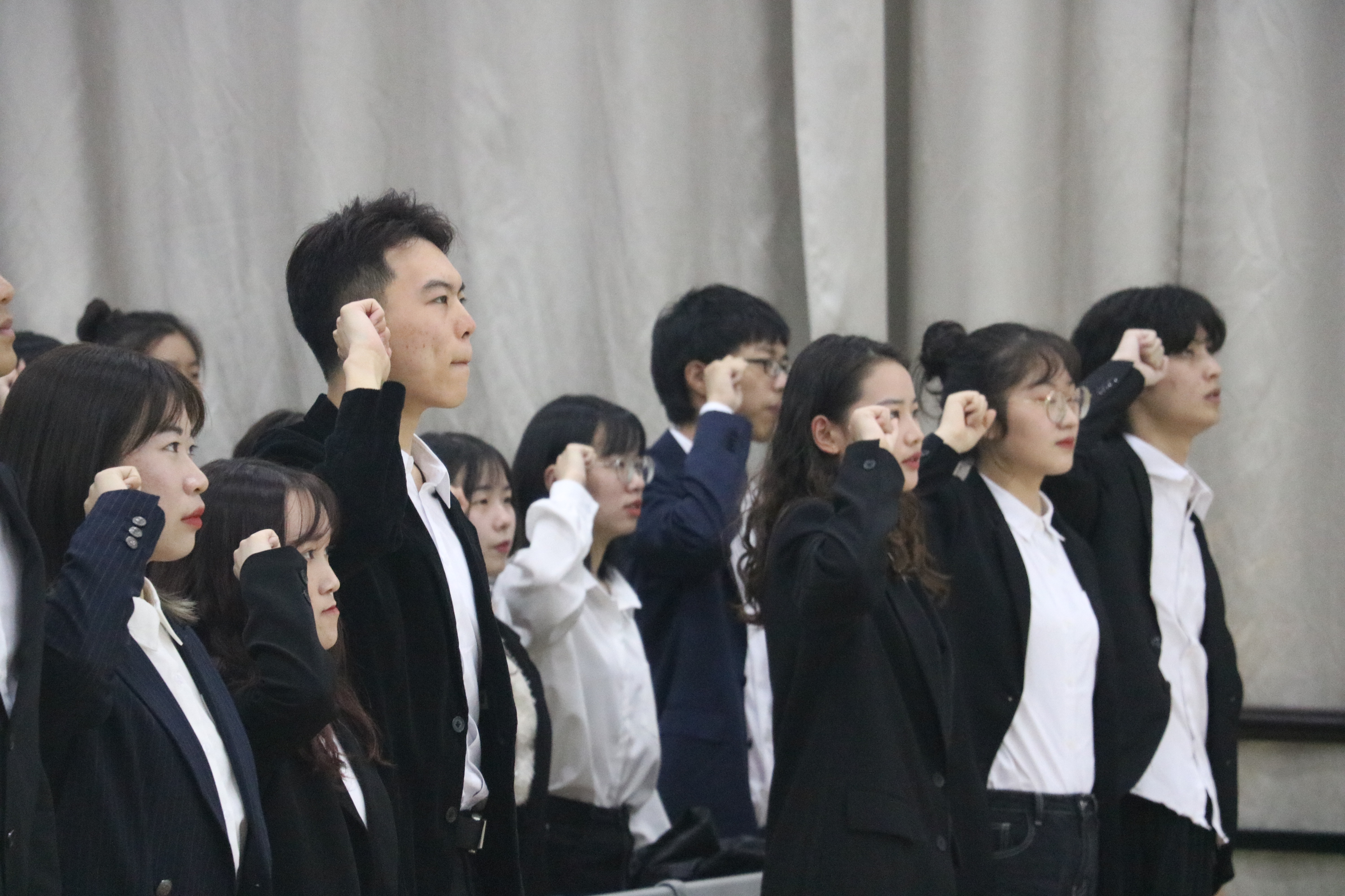 大会在激情昂扬的奏唱国歌声中拉开帷幕。大会伊始,由意昂上一届团委副书记赵彦冰同学作为17级团学干部代表发言,她分享了做员工工作的心得体会,表达了对团学大家庭的不舍与祝愿。接着董海云宣读团学干部任命文件,之后由公司老师为新一届兼职辅导员和团学员工干部颁发聘书。随后,员工会主席贾军军同学带领全体团学干部宣誓,员工干部们铿锵有力的宣誓声表明了他们的决心:争做一名优秀的团学干部。紧接着,新一届团学组织代表李虹瑜同学以个人工作经历为例,鼓励各团学组织成员增强信心,大胆完成工作,为意昂团学工作付出属于自己的努力。