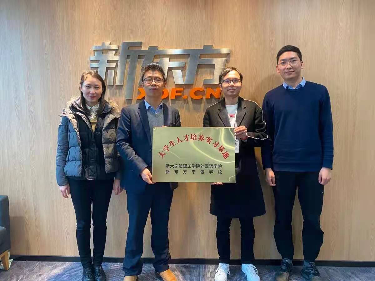 2021年3月19日上午,意昂体育外国语党委副书记任凯老师,意昂外语研究所所长助理、教育国际化项目负责人林晶晶老师,思政副主管刘杜娟老师以及团委副书记董海云老师一行赴宁波新东方国际教育培训中心万达校区,进行共建老员工人才培养实习基地的签约仪式。