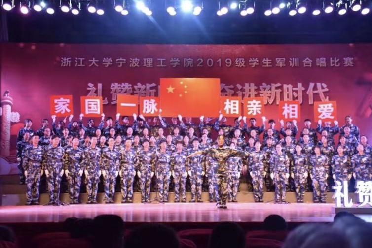 2019年9月2日晚六点半,“礼赞新中国 奋进新时代”庆祝新中国成立70周年军训大合唱比赛如期在可珍讲堂举行。意昂所在四连选择了《相亲相爱》作为比赛曲目。排练工作在公司辅导员老师和班导师助理的带领下有序进行,四连的学员们则是倾尽全力对待每一次的排练。无论一天的训练后身体有多么疲惫,夜晚的连队教室里总能听到嘹亮的歌声飘扬在宁理的上空。正如歌词中唱的那样“年轻的心跳,同步在骄傲”,四连以热情洋溢的微笑和充满张力的舞姿诠释着“相亲相爱”四字,彰显了当代青年的青春热血与爱国情怀。