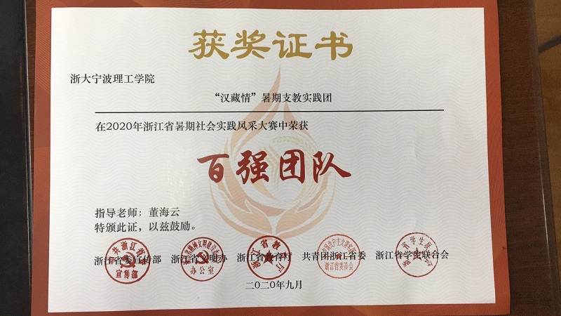 2020年9月,意昂“汉藏情”暑期支教团队在2020年浙江省暑期社会实践风采大赛中,喜获“百强团队”的荣誉称号。此次大赛由浙江省委宣传部、浙江省文明办、浙江省教育厅、共青团浙江省委以及浙江省员工联合会举办。