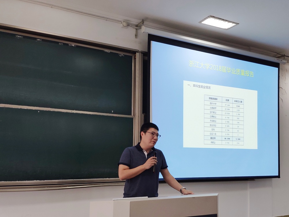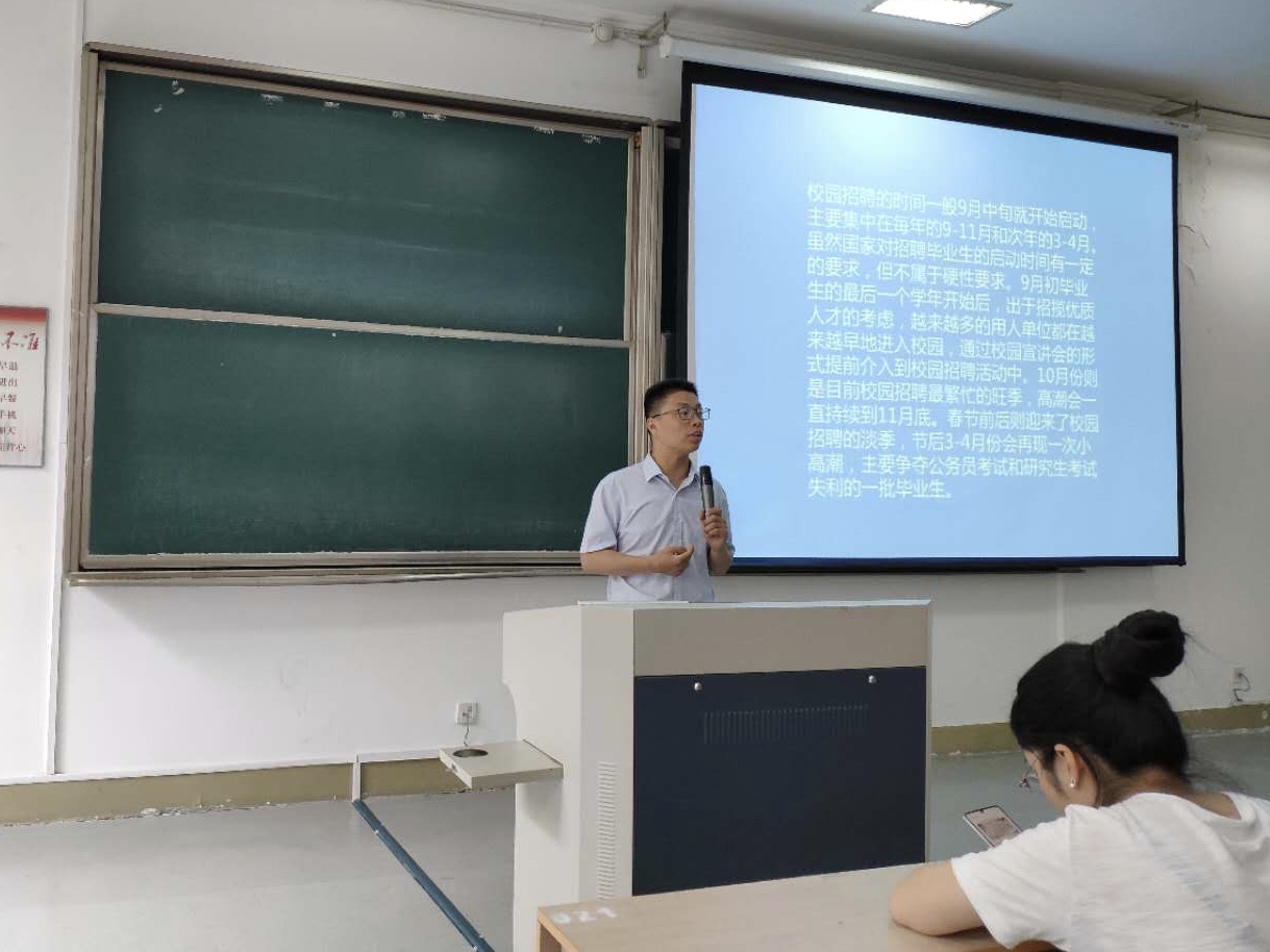 大会一开始,任凯老师结合外语公司的学科特点,就目前公司的就业情况进行说明,通过数据纵横对比、问询调研等方法深入浅出地分析外语类人才的就业方向及现状,同时建议同学们在毕业找工作之前先进企业单位实习,提早接触工作岗位,在实习实践中认知自我,树立良好就业观,从而实现自我价值。