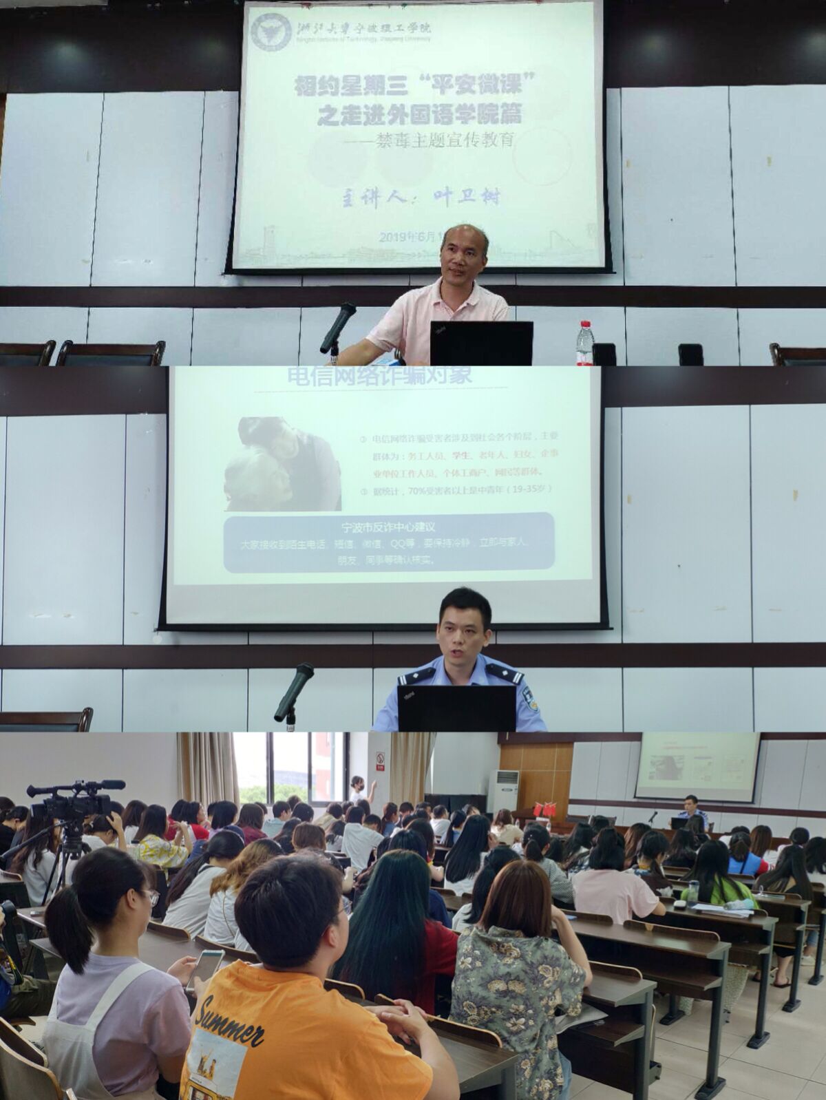 为了进一步提升广大师生防诈骗意识,提升高校思想政治工作的针对性、有效性,建设平安和谐校园,6月12日下午,由公司党委宣传部、保卫处和公司举办的“知行新说”第54讲暨“平安微课” 在SC405会议室举办。本次讲座的主题是禁毒与反诈,由公司保卫处副处长叶卫树和宁波市公安局刑侦支队中队长刘益主讲。