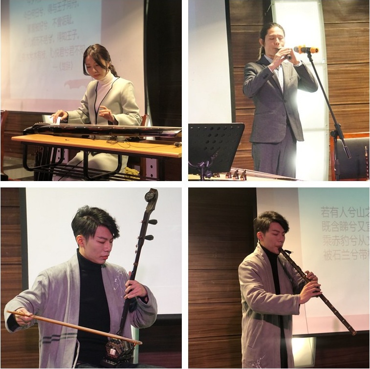 活动伊始,柴昀喆老师用风趣的语言为大家从伏羲斫琴开始,在古琴、埙、箫、尺八等乐器的发展中,悉心讲述中国古代音乐的发展史。柴老师寓教于乐,讲完一段历史便演奏一段乐曲,优美动听的曲调,让全场参与人员顿时安静下来细心聆听。