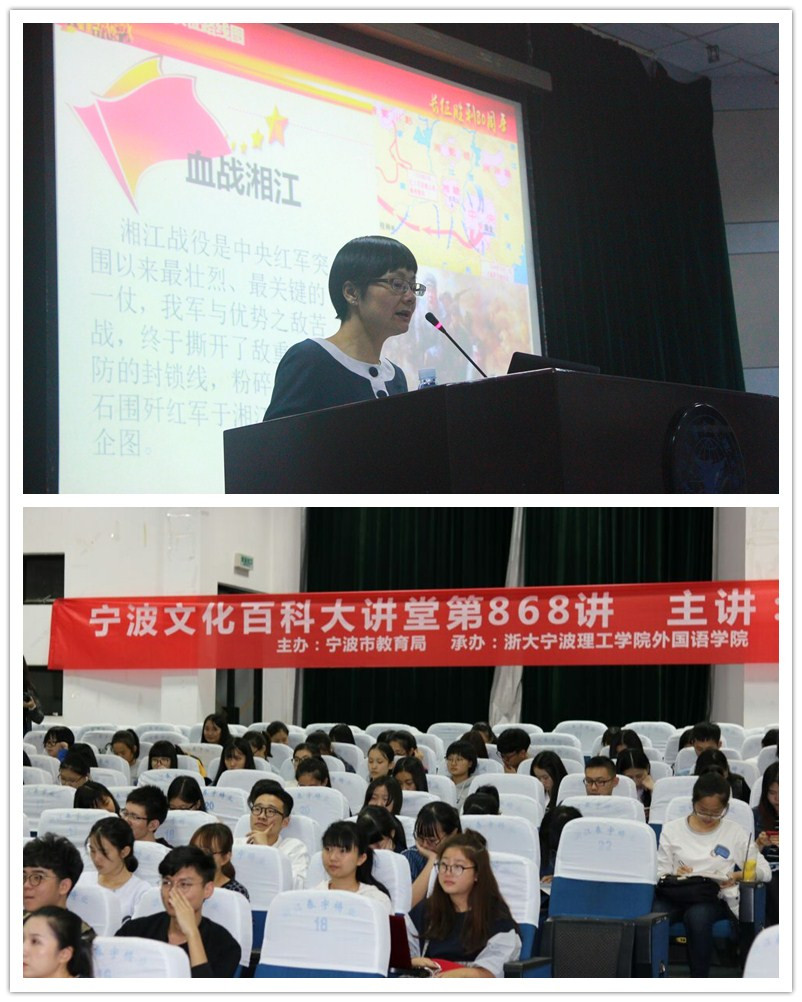 10月9日晚,由宁波市教育局主办,意昂、经济与贸易公司和校团委联合承办的宁波文化百科大讲堂第868讲暨纪念长征胜利80周年专题讲座在NF103举行。公司党总支书记谌晓煜、校团委副书记夏文来、教师代表、公司青马班学员、党员和团员代表等近400人参加了讲座。活动由公司党总支书记谌晓煜主持,宁波大学法公司罗维教授主讲。