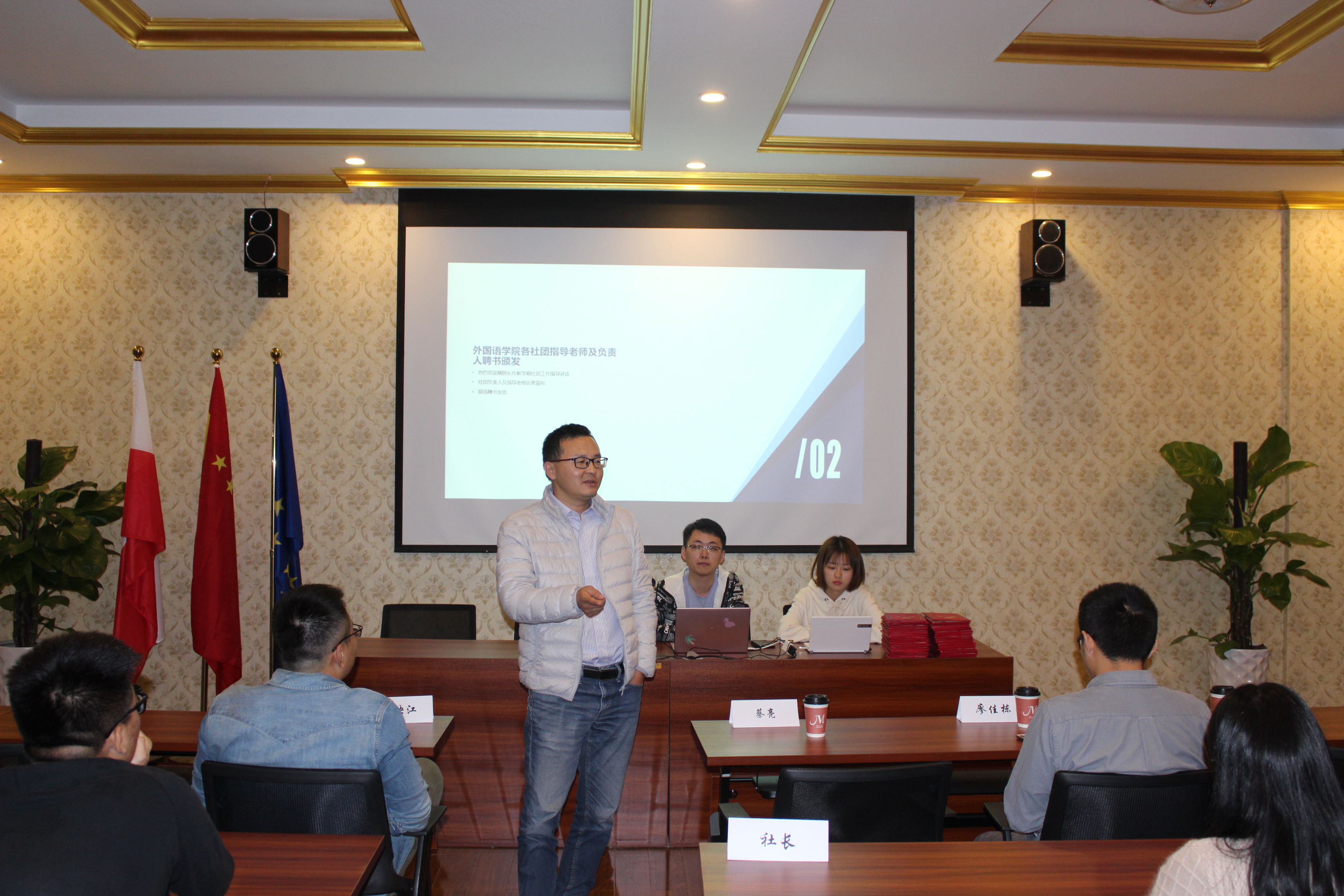 2018年10月29日18:30,外国语学联在波兰文化交流中心举行2018-2019学年社长大会。意昂副经理蔡亮老师莅临大会,参加大会的还有各社团指导老师、社团社长和副社长。