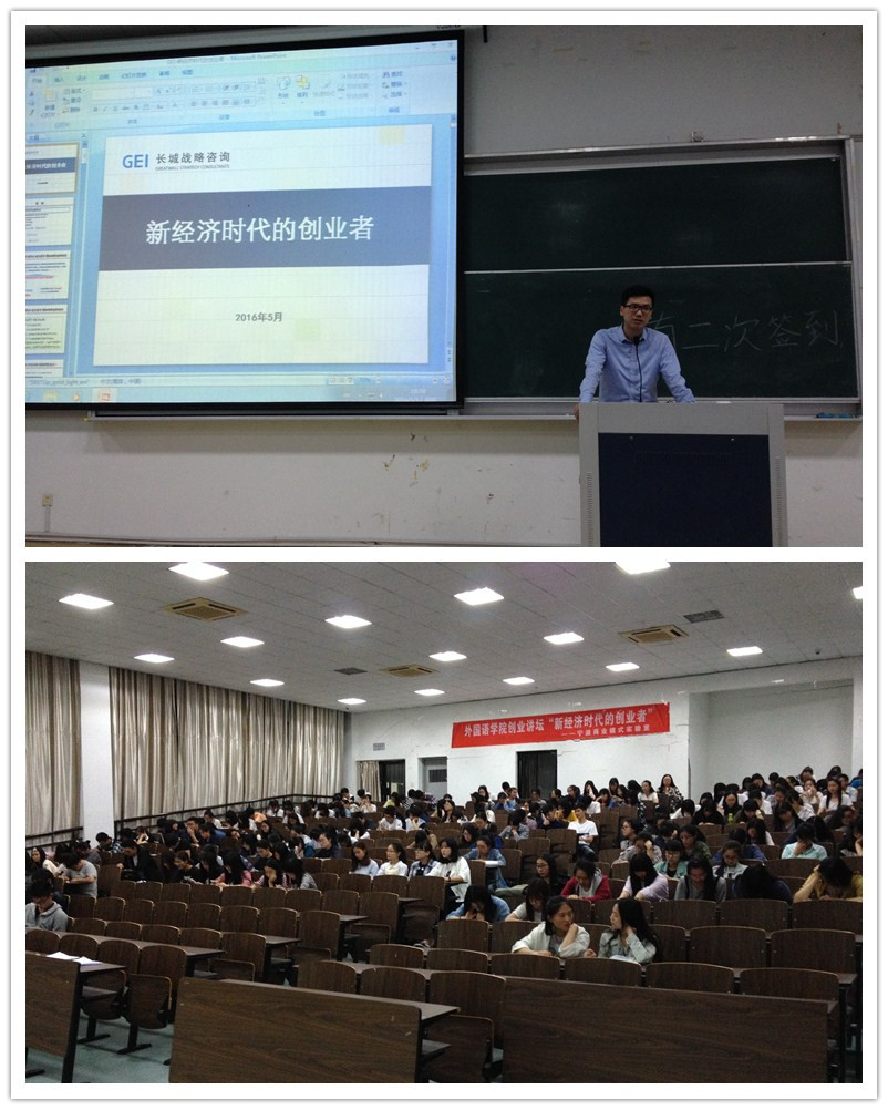 为积极引导老员工了解创业知识,培养老员工创新意识,树立创业精神,提高创业能力。5月18日晚,外国语外公司邀请宁波长城战略咨询所专家周涵洋老师举行了一场题为“新经济时代的创业者”的主题创业讲座。