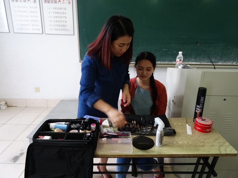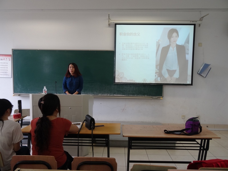 然后老师将一位同学作为范例,现场进行了职业生活妆的展示。女生在化妆前需做好面部清洁,而后用隔离霜起到保护皮肤不受化妆品损害的功效。接下来老师推荐使用液体的粉底均匀刷在脸部。若是有痘痘的女生还可用少量遮瑕膏涂抹眼睑等部位。再用定妆粉轻轻涂抹眼部,粉饼涂抹脸部以防止出油。其次是眼妆,职业妆一般使用浅色系的眼影,由睫毛根部向里轻轻涂刷,再用深一点的眼影二次上妆。之后,使用防水性能比较好的眼线笔化在睫毛根部,选用睫毛胶好的睫毛夹分别夹睫毛根部、腰部、尾部各5秒,再用睫毛膏定型。最后是面妆,选用和发色相近的眉粉画眉,再用口红代替普通腮红,取较优雅的裸色按压在笑肌上。而口红也要选用与腮红颜色搭配的,再用唇彩涂开。老师还特别提示,觉得自己脸大的女生可以用暗色粉饼沿着脸的轮廓刷在发际线边上。除妆容之外,我们还需要把头发打理干净,做到整体形象优雅大方。