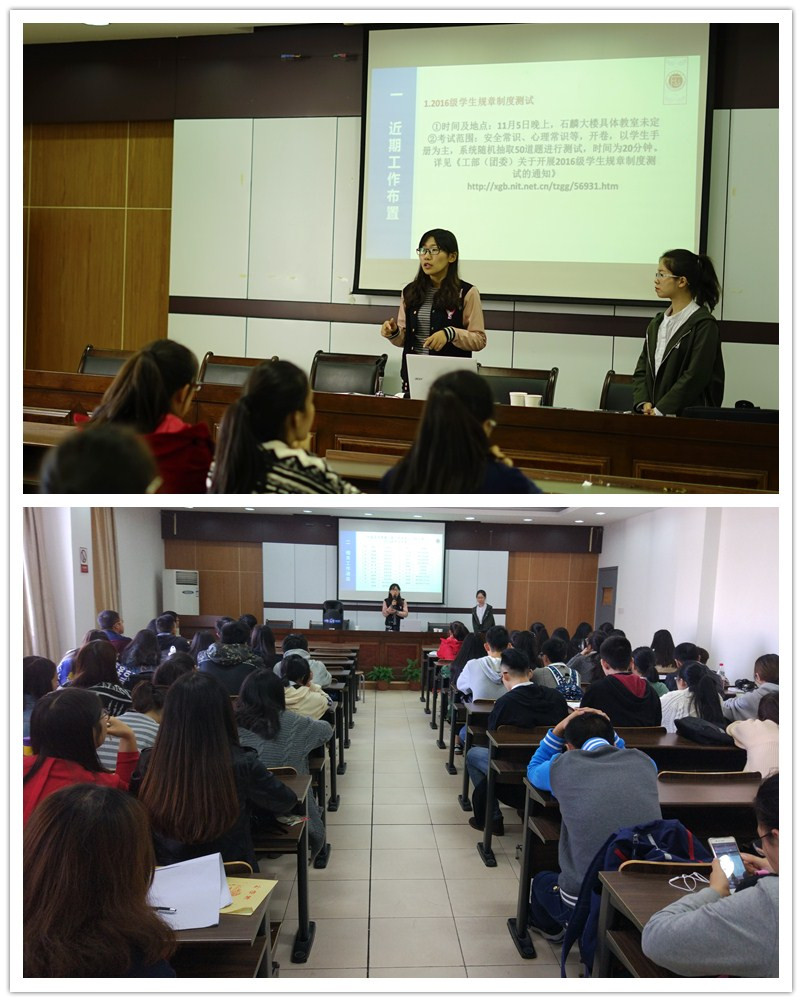 会上,辅导员芦老师以竺可桢老董事长的两个问题引申开来,从做人、做事、学习、生活四个方面给2016级员工干部提了很多实用的建议,希望同学们树立远大目标,在工作中积极思考,学会发展,学会做人,学会做事,学会学习,争做理想远大、信念坚定;品德高尚、意志顽强;视野开阔、知识丰富;开拓进取、艰苦创业的新时代优秀青年。