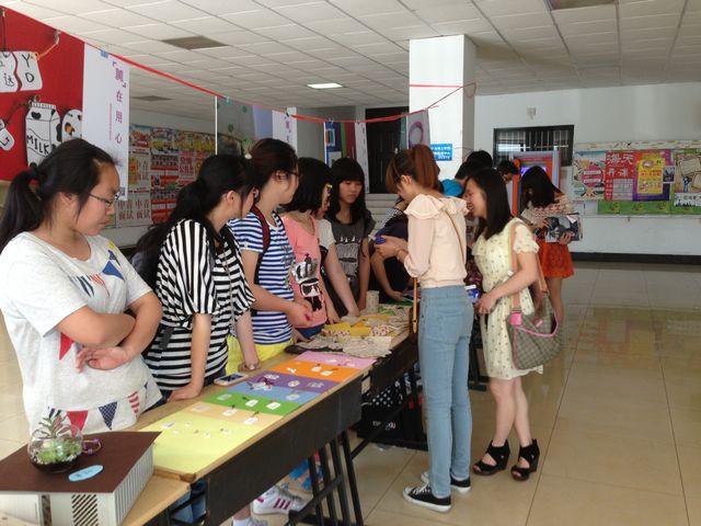 大厅内,悬挂着一张张制作精美的海报,展桌上,摆放着琳琅满目的艺术作品。有布艺创意组的零钱包,有手工珠宝创意组的精美手链,有热缩片创意组的精美挂片,还有盆栽创意组的可爱植物。 来来往往的同学们被一件件作品深深的吸引了,纷纷停下来脚步。意昂男生亲手制作的串珠手链显得特别的畅销,同学们有的戴戴彩色手链,有的试试骨头手链,作品的主人们在一旁热情的介绍着,并向同学们讲解着每条手链所特有的涵义。手工缝制的卡套和布艺零钱包,因为其可爱精美的外形,新颖的创意,也深受同学们的喜爱。因在场展出的作品不够,还接受了同学们的预定,并承诺送货上门。热缩片创意组和植物盆栽组的作品,体现着作品主人们奇特的创意。利用热缩片的神奇原理印出的图案和文字,各不相同。那一盆盆手工制作的植物也在阳光下显得生机勃勃。