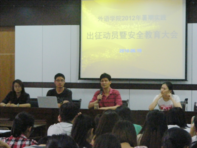 员工团委副书记卓丹华同学宣读了《外语公司员工暑期社会实践安全制度与应急处置方案》,就暑期社会实践中可能遇到的安全问题向大家做了相应介绍,通报了应急处置方案并要求各实践团队遵照执行。