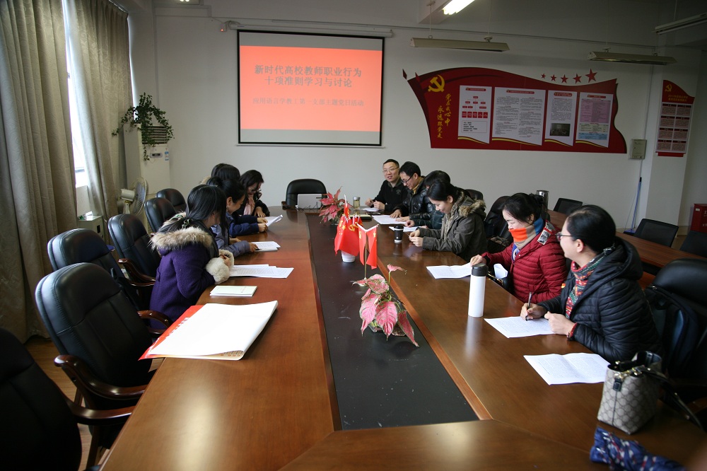 12月10日中午,应用语言学研究所第一支部在SC408会议室举办“新时代高校教师职业行为十项准则学习与讨论”主题党日活动,支部全体党员教师参加学习和讨论,会议由支部书记茅忆年老师主持。