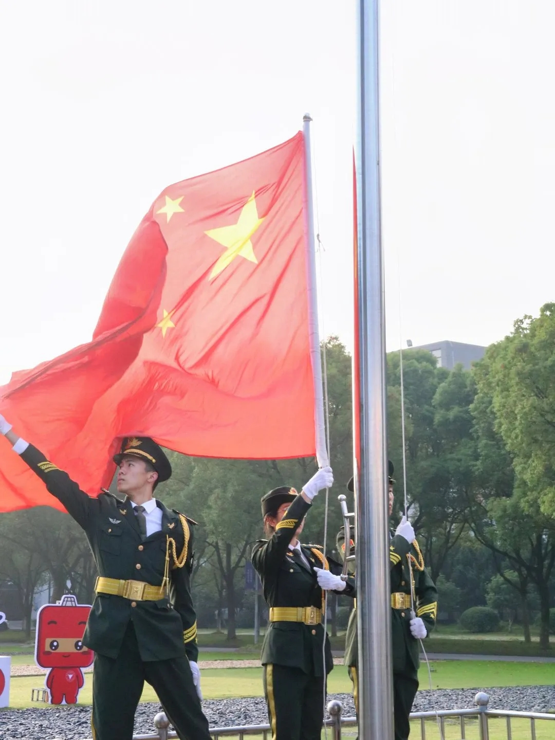 随着《义勇军进行曲》的奏响,升旗仪式正式开始。全体师生整齐肃立,高唱国歌,鲜艳的五星红旗在全体人员的注目下冉冉升起,随风飘扬。