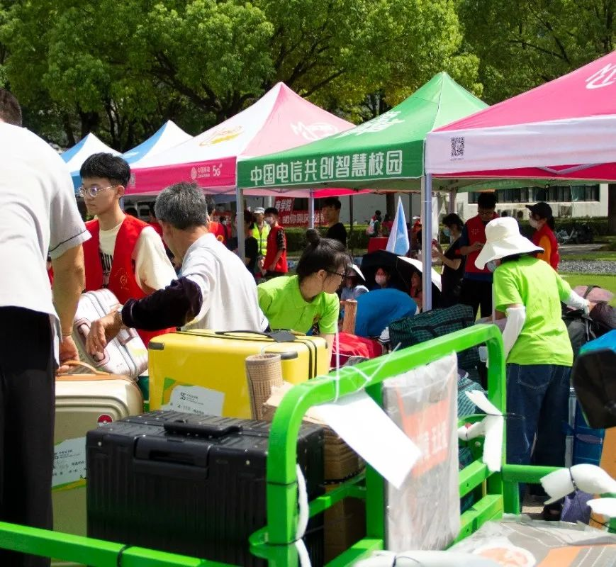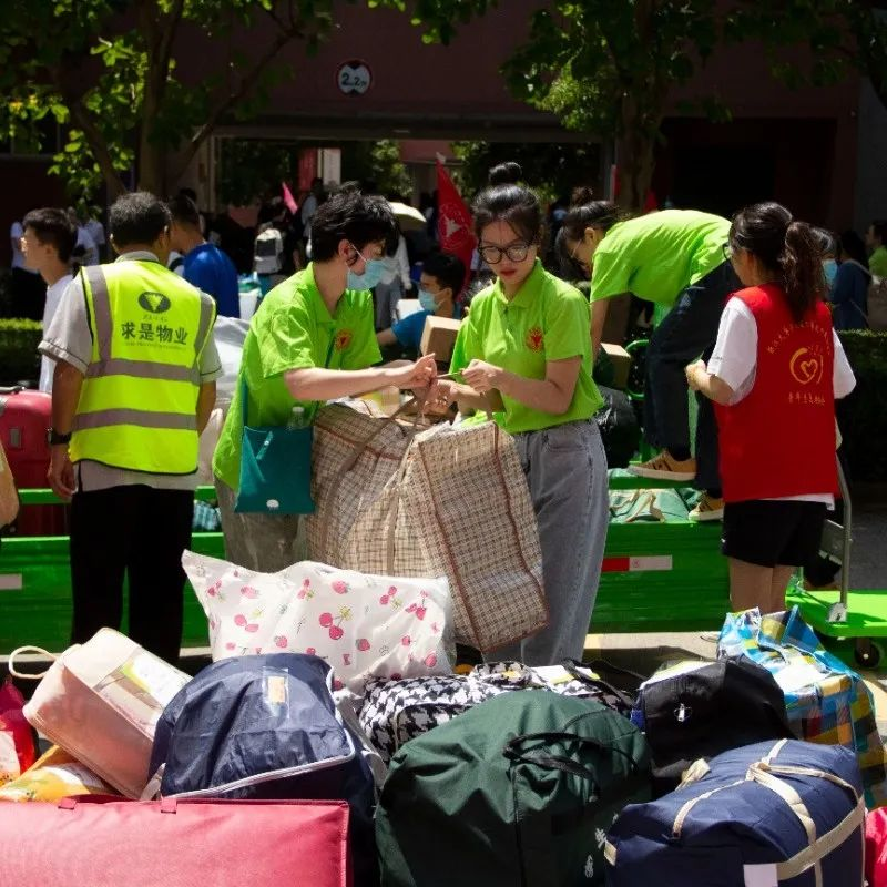 一群身着绿色院服的志愿者们穿梭在校园中,正在开展2022级新生接待志愿服务活动。