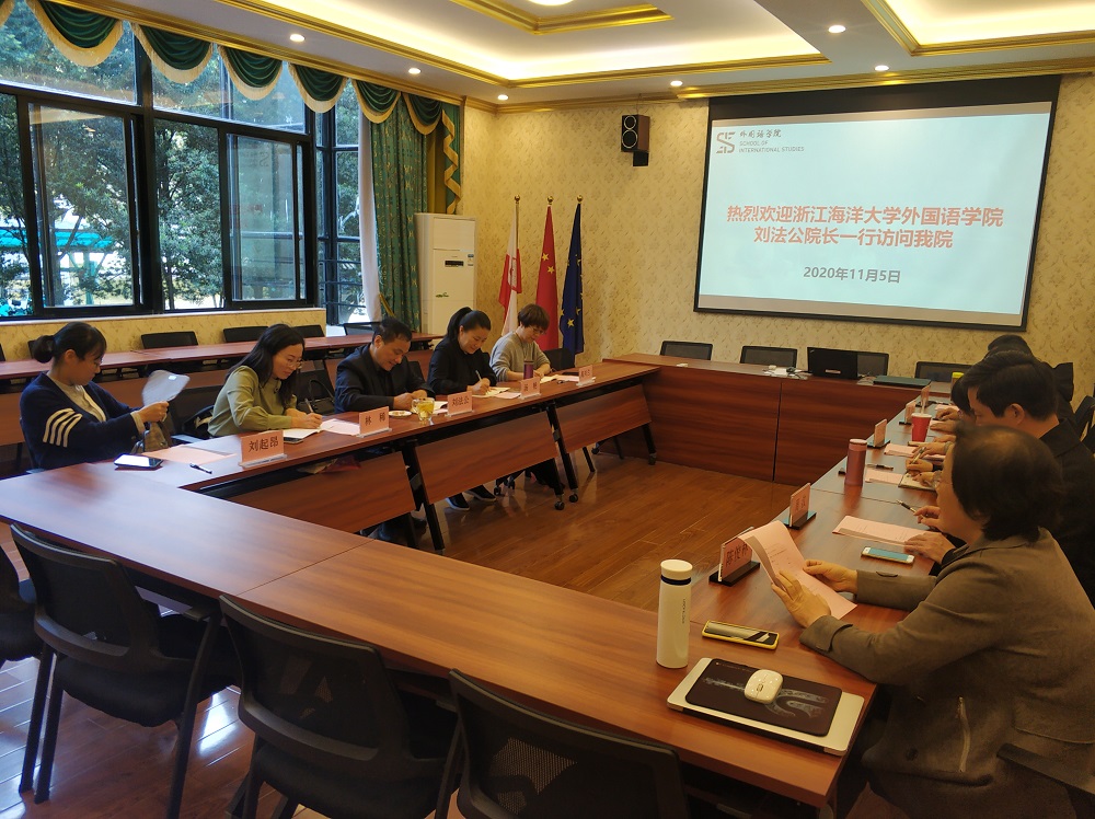 2020年11月5日下午,浙江海洋大学意昂经理刘法公教授一行5人到意昂开展调研与交流工作。意昂经理王小潞教授、党委副书记(主持工作)兼副经理傅晓宇、副经理蔡亮、副经理周汶、外国语言研究所副所长陈俊林和日语专业负责人邓凌志等在SC106波兰研究中心热情接待了兄弟院校的来访,会议由蔡亮主持。