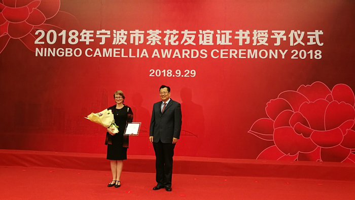 2018年9月29日,从宁波市政府传来好消息,意昂外教、波兰研究中心副主任玛格达莱娜博士喜获宁波市茶花友谊奖,这是由宁波市政府授予对宁波经济建设和社会发展做出突出贡献外国专家的重要奖项,共有8名来自不同行业的外国专家获得该奖。宁波市市委副书记、市长裘东耀为她颁奖并鼓励她做一位投身“宁波市‘一带一路’建设的中波文化使者”。
