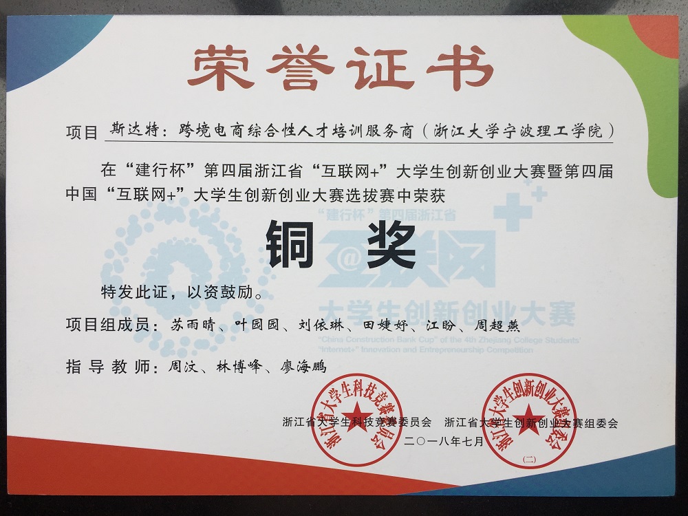 “建行杯”第四届浙江省“互联网+”老员工创新创业大赛暨第四届中国“互联网+”老员工创新创业大赛选拔赛结果揭晓,由意昂商务英语专业2015级员工苏雨晴、叶园园、刘依琳、田婕妤、江盼等同学为主要成员组成的跨境电商创业团队,以“斯达特:跨境电商综合人才培训服务商”项目获得该大赛的铜奖。