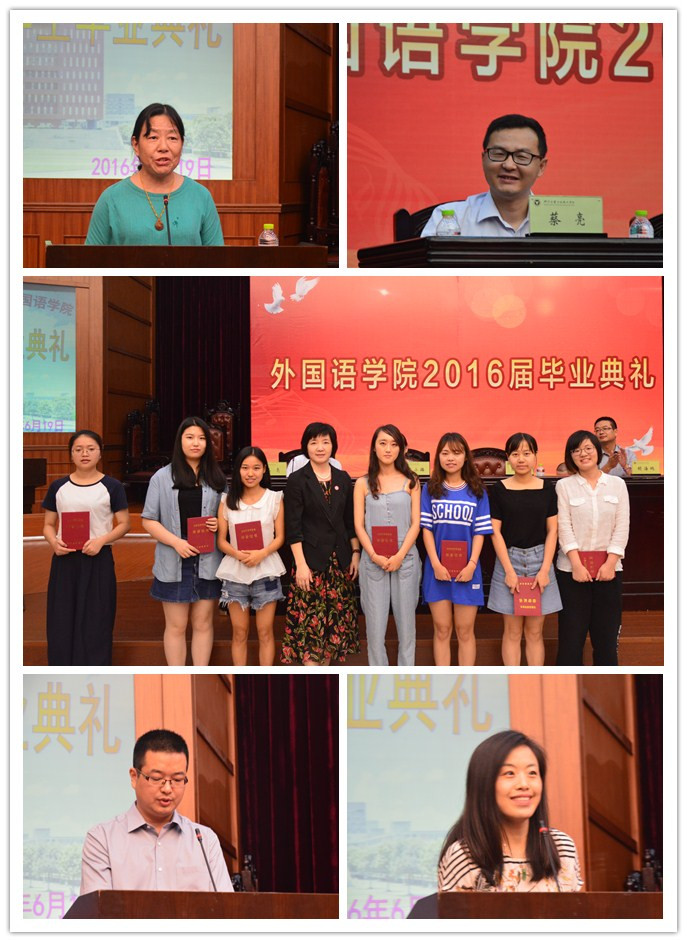 在发言席上,公司王小璐经理用全英文向全体毕业班同学致辞,她希望同学们永怀感恩之心,走出校园后在新的岗位上继续奋发努力,在未来的人生道路上飞得更高,走得更远;教师代表李飒老师用“仰望星空,脚踏实地”作为临别赠言,她希望所有的外语学子有时间还能来随园读读外语,在阳明学堂谈谈文化,喝喝咖啡,一切恍若昨日,一切充满希望;英语125班的李新新同学作为毕业生代表,在离别致辞中回顾了大学四年的生活,勉励学弟学妹们坚持奋发图强,学好外语并表达了对母校的感激和祝福;商英131班的章丽琼同学作为在校生代表向即将离开母校的学长学姐们表达最真诚的祝愿,祝福学长学姐工作顺利,记得常回理工看看,常回家看看。