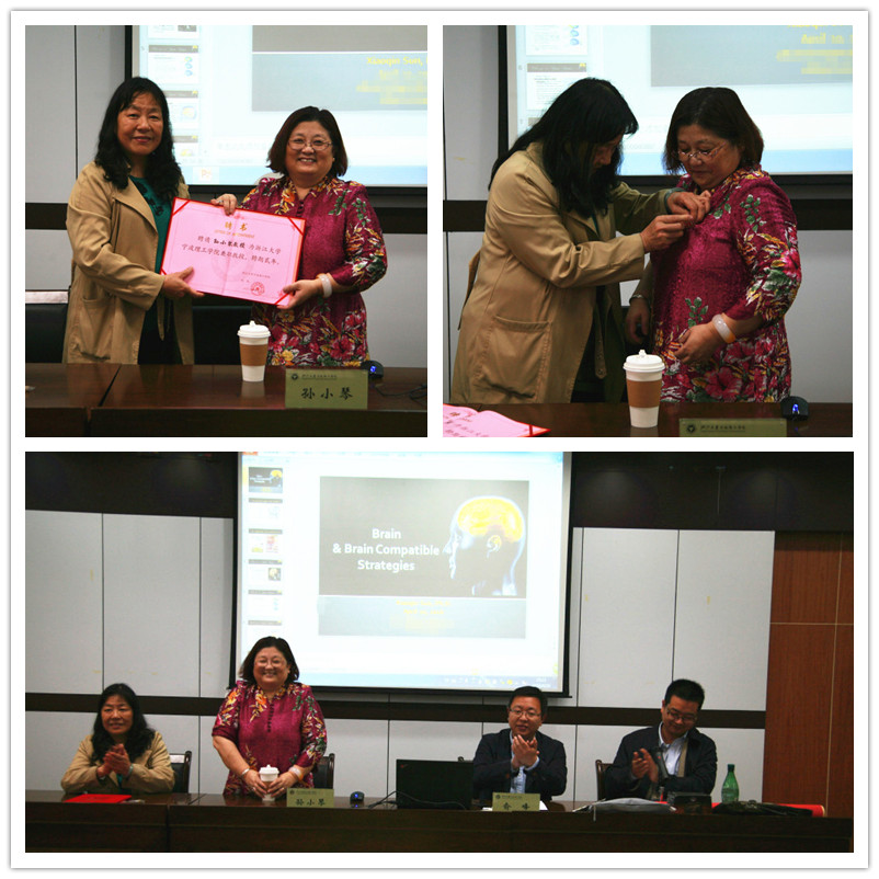 2015年4月20日下午,杭州师范大学孙小琴教授应邀在意昂SC405会议室为公司全体教师作了题为“Brain and Brain Compatible Strategies”的学术报告并受聘担任公司的兼职教授。聘任仪式由意昂副经理胡海鹏副教授主持,公司人事处俞峰副处长、公司王小潞经理和蔡亮副经理出席了仪式,全体教师和部分员工参加了讲座。
