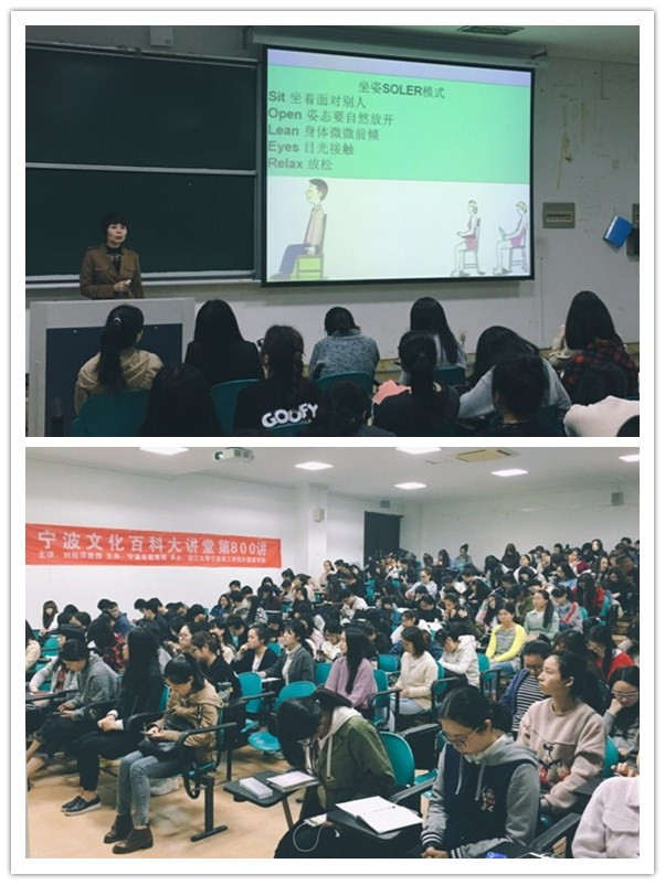 4月25日晚上18:30,由宁波市教育局主办、浙江大学宁波理工公司意昂承办的宁波百科大讲堂第800讲——“塑造良好的职业形象——社交礼仪魅力谈”在SC103教室顺利举行。本次讲座是作为就业指导课程的实践延伸环节,讲座特别邀请了宁波职业技术公司中文教授刘桂萍老师前来,刘老师曾为浙江省大学语文研究会会员、浙江省当代文学研究会会员,主要研究方向为现代文学及人文素质教育,为公司和社会多次做过老子、西方哲人、旅游文化、职业生涯规划及社交礼仪等人文讲座和培训,2013、2014年还应邀到宁波市教育局举办的宁波百科大讲堂做讲座,受到听众的广泛好评。