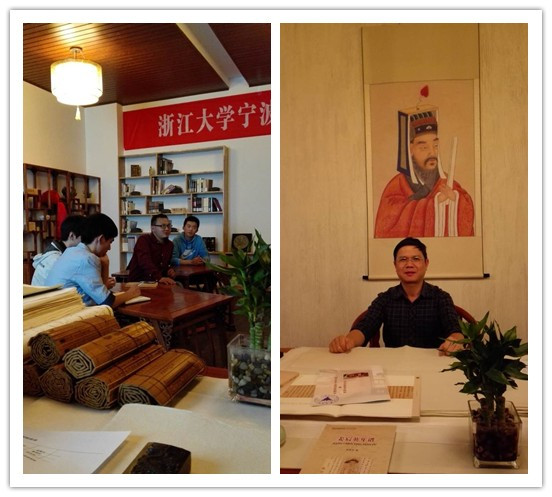 在诗会伊始,蔡老师首先向现场观众介绍了阳明学堂:它以王阳明先生的字命名,入口墙壁上的简介便记载了王阳明先生的事迹,整个学堂的建筑风格和所传达的文意皆出自王阳明先生的作品。此外,学堂里的一些艺术品都是老师们亲手“淘”来的,学堂内的伏案、茶几也都透着古朴之气,更有趣的是阳明学堂的外间便是英语角和咖啡厅,如此设计恰到好处的体现了中西合璧的思想。