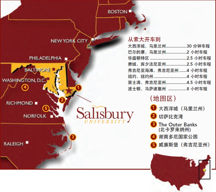 索尔兹伯里大学位于马里兰州,毗邻大西洋,临近华盛顿、纽约、费城、巴尔的摩等美国重要城市,处于北美政治、经济、历史文化的核心区,地理位置优越。索尔兹伯里市环境优美,该大学属于美国公立院校的佼佼者,全国排名一直在本科院校前10%的行列,荣获吉普林个人理财杂志“最有价值公立大学”100强。该校商公司受美国著名食品公司普度(PERDUE)公司赞助,为工商业甚为发达的马里兰州顶尖的商公司之一。近年来,索大与国内多所高校签署了合作协议,其中包括北师大珠海分校、中山大学新华公司、宁波大学等知名高校。