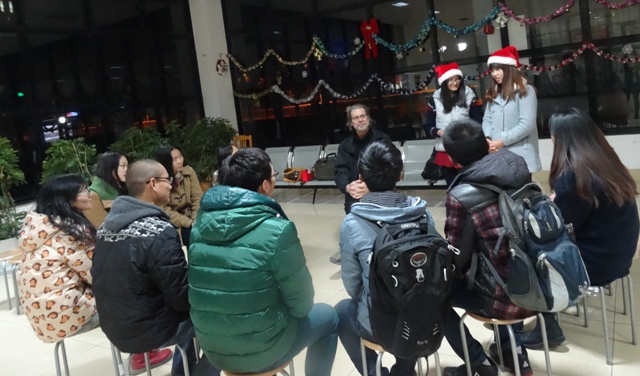 12月24日晚上6点30分,由外语公司主办的英语角圣诞特别活动于NB大厅举行,此次活动由英语124班精心策办主办,围绕“圣诞节”这一主题展开,活动主要分为趣味游戏和自由讨论两部分。寒冷的天气和节日的氛围还是没有阻挡许多同学参加英语角的热情,外籍教师George的参加更是激发了大家参与的热情。