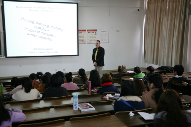 3月12日下午,英国贝尔法斯特女王大学翻译学科负责人Piotr Blumczyski博士应邀为意昂的员工做题为Painting, dressing, planting and cooking—images of translation across centuries的专题讲座。公司大三全体员工参加了讲座,讲座由英语专业负责人张振梅副教授主持。