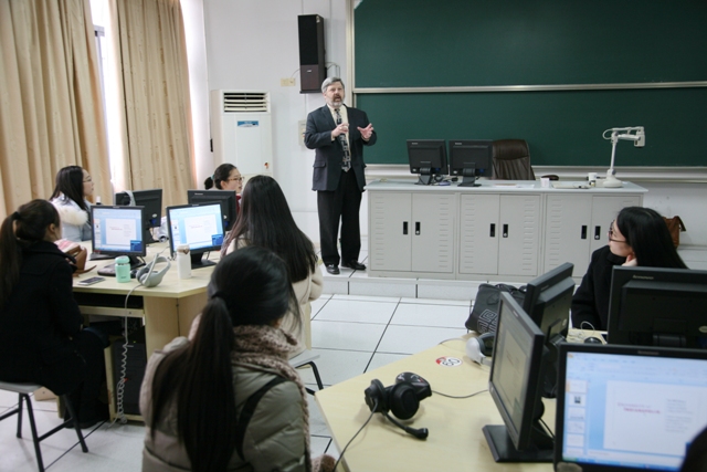 1月7日,雨后,极其普通的一天,因为莎翁的到来,一切变得不同。由浙江大学宁波理工公司意昂策划举办的一场讲座在SB404拉开帷幕,此次演讲很荣幸的邀请到印第安纳波利斯大学文理公司副经理、莎士比亚专家Bill Dynes教授,为我们讲授莎士比亚时代社会环境、演出剧院和莎翁生平。在讲座正式开始之前,我们设计了一个互动环节:由千面中英文戏剧社成员表演《仲夏夜之梦》的经典片段。 千面中英文戏剧社集两年的集体创作精华,北上北京大学求教于莎剧表演大师,在甬求教于剧团一流演员,将无数个日日夜夜的排练,浓缩在八分钟的舞台流转中。精彩的演出得到了比尔•戴恩斯博士的高度赞赏。来自外语公司和信息公司的员工分别扮演民工、精灵和仙后的角色。几个民工利用工余时间排练话剧,要实现自己的艺术梦想。在郊区的树林里,大家正认真排练,不想精灵出现,把纺织工波顿变成了驴子,竟得到仙界王后的垂青。八分钟,比尔教授的笑声伴随着整场演出,我们的每一个原创设计都得到了他的认可。短剧的其他方面,比尔教授也作出了点评。首先是演出地点。由于教室表演空间不足,剧社指导老师请大家移步到我们的“临时剧场”——SA大厅电梯旁的大片空间,不料比尔认为这恰恰证明了莎剧的普适性,电梯口的人来来往往,莎剧自成一体,这真是个奇妙的戏剧体验。四百年前在环球剧院上演的莎剧,四百年后,在中国大学的电梯旁空地有了新的诠释。其次是剧目的选择,《仲夏夜之梦》恰好是比尔最喜欢的剧目,我们八分钟场景的选择被他称为是“精挑细选”。再次是舞美,比尔说我们用了一点点化妆,一点点服装,一切就不一样了,因演戏需要舞美,但莎剧不需要太多的舞美,我们这样的安排恰好得莎剧之精髓。 比尔教授的讲座言简意赅,用几张图片、几段莎剧原作引文、深入浅出的语言,将四百年前的那个时代带到了我们面前。当时的伦敦、当年的剧院。三千名观众没有现代的扩音设备帮助,怎么能听到演员的声音?——讲座中,有人这样问。当时女性不能上台演出,是不是对女性有歧视?——有听众这样问。《仲夏夜之梦》的仙后在当代剧院常常吊威亚飞来飞去,莎士比亚时代的仙后是怎样来去的?——又人这样问。《李尔王》首演是圣诞节,这样的大悲剧放在中国的春节演是不可想象的,在英国这是怎样的传统?——还有人这样问。莎士比亚、我们、伦敦、宁波、环球剧院、SB404、1600年、2015年,在每个人的心里,这些时空的标记都淡去了,消逝了,留下的,是人类亘古不变的主题。