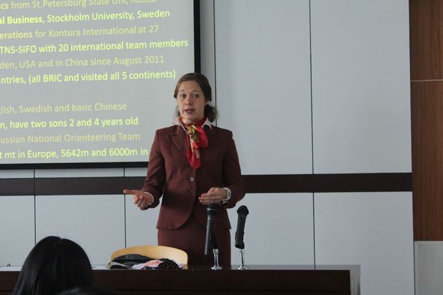 做一个有梦想的人,我们才能展翅高飞;成为一个有领导力的青年,我们方能弘毅前行。 3月30日下午,来自TNS信息集团瑞典分公司项目部经理Natalia Fey(娜塔莉亚-费)女士应邀对公司青马和意昂的同学们进行了“青年国际领导力研修班”的首次培训。 Natalia Fey(娜塔莉亚-费),瑞典人,俄罗斯圣彼得堡国立大学经济学硕士,瑞典斯德哥尔摩大学工商管理学硕士,曾在俄罗斯、瑞典、美国和中国多家跨国公司任职,跨文化商务从业经历丰富,长期担任TNS信息集团瑞典分公司在多个国家的市场开发部经理,有多个国家客座讲师经历,可以熟练使用俄语、英语和瑞典语三种语言,也能用日常汉语交流。目前,她与任教于宁波诺丁汉大学的丈夫居住于宁波。 开课伊始,她用英语首先向在座的同学介绍了自己,亲切的目光和温柔的声音感染着在座的每一位同学。当她让同学们互相交流认识彼此时,教室里顿时沸腾起来。大家都显得很兴奋,天马行空,似乎有说不完的话题。虽然双方的认识时间不到几分钟,大家却对彼此有了很多了解,每个成员都在课堂上对自己的同伴进行了介绍。在课上,娜塔莉亚详细地向员工们讲述了如何学习和培养自己的领导才能,给予了员工们很多发表感想的机会。令人惊喜的是,她还安排设计了一个游戏,使原本生硬难懂的课程内容变得十分丰富有趣。在这场游戏中,同学们得到了很多互动的机会,每个小队的两名成员带着眼罩由一名领导者带领着在满是座位的教室里走动。一些同学分享了自己的感受,在不能看见外界而完全只能靠别人引领的情况下,他们的心情都很忐忑焦虑,害怕自己会撞到墙或桌椅。通过这个游戏,娜塔莉亚使学员们深深地明白到在一个团队中领导者的责任是非常重大的,每个抉择都可能影响到团队里的成员。最后,在热烈的掌声中,她用四种语言道谢并圆满结束此次课程。 “青年国际竞争力与领导力研修班”由校团委联合意昂(宁波市国际文化研修中心)共同举办,是进一步深化落实公司“开放办学”理念,创新人才培养模式,不断拓宽公司老员工的国际视野,有效提升理工学子综合竞争能力的重要尝试。在接下来的时间里,理工学子还将接受跨文化谈判能力、时间管理能力、国际团队协作能力、国际团队领导力、国际商务与交流核心职业能力等方面的培训,良好的开端是成功的一半,相信这第一节课必将为同学们今后的学习之旅添上浓墨重彩的一笔!