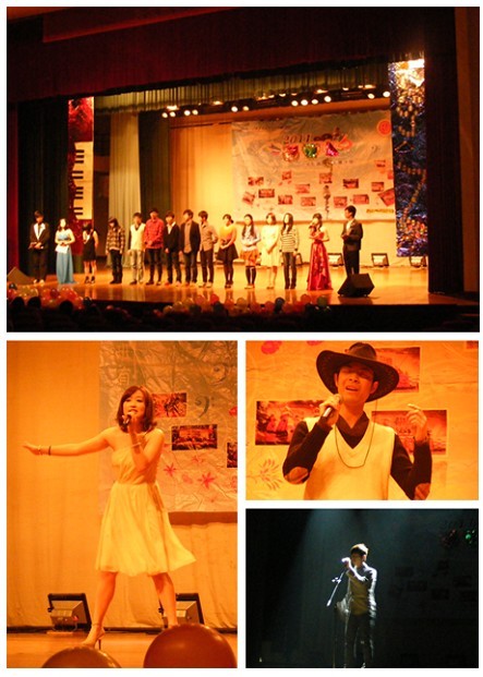 开场的一段优美动听的钢琴旋律让热闹的讲堂顿时安静下来。随着主持人的一番开场词,选手们依次登台集体亮相进行第一轮外文歌比赛,在舞台上献上出色的才艺展示。多首英文歌曲过后,一曲日文歌的穿插让观众享受了不同风格的表演,现场气氛立即活跃起来。张璧联珠深情一曲《one more time》牵动观众的思绪,大家都陶醉在美妙的歌声中。姚江明挑战迈克尔.杰克逊的经典《you are not alone》,起唱仿佛原音重现,赢得了一阵热烈的掌声。第二轮为3分钟才艺展示,歌手们不约而同地选择了中文歌曲的演唱,2号选手潘嘉贝一首《好春光》引起了台下观众和评委的共鸣。两轮比赛结束后,有5组选手遗憾地离开了舞台。剩下的5组选手则进入了接下来的两轮淘汰赛。最后的两轮比赛更加激烈,台下粉丝团更是尖叫连连。全场比赛结束,外教Abby及前艺术团团长俞懿窈对每一位选手做了点评。