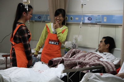 面对病床上脆弱生命,队员们潜伏着的仁爱天性如春天的阳光洒向幽暗的角落。他们在日志里写道:“一层皮肤紧贴着骨头,我的手触及他僵硬的腿,我的心像针扎,……我多么希望爷爷能感受我手指所传递的温度,让这温度化作一股动力让他度过难关。从来没有像现在这样希望一个陌生人好起来”。“我触摸了5个不同的身体,第一次埋怨自己平日还算灵巧的手,今天是如此笨拙。该用怎样的姿势和力度,才可以把心底的期盼传达给他们?” “……长时间的躬身和手指用力过久,我感到腰部酸痛,手指也僵硬起来,可是我并没有站直身子,我害怕我的细微改变会造成奶奶的不适。” 有个队员为一个双腿浮肿的病人按摩了近2个小时,浮肿的双腿终于在她的努力下消退了,尽管手酸透了,但她心里有种从来未有过的高兴。一个队员在访谈中说:“我们知道我们承担着搀护他们走完人生最后一程的使命,我们的存在会赶走他们的孤独,使他们在最后的日子里感受到阳光。”