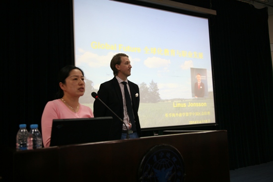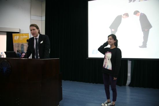 讲座还未开始,NF103教室就已经座无虚席,金发碧眼的Linus先生非常年轻帅气,他曾先后担任了英孚教育集团亚太销售与市场总监,英孚海外游学中国区总经理,成功帮助了数万名亚洲员工实现了出国留学和游学的梦想。在讲座中他首先介绍了自己离开家乡瑞典,在日本、中国、澳大利亚的顶尖大学学习、进修、工作的精彩历程,一口纯正的英语很难让人置信这竟不是他的母语。为了更好地让同学们理解不同文化的差异,Linus先生还热情邀请同学们上台与他互动,二人生动的为大家表演了不同国家的人所不同的打招呼方式,现场气氛热烈非凡。