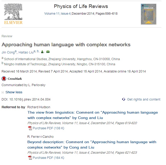 刘海涛教授团队这次能受邀为PLREV撰写有关语言复杂网络的review,主要得益于多年来他们已在本领域所取得的多项国际领先研究成果,也是该团队多年来坚持采用跨学科研究方法研究语言的结果,是公司在这一研究领域国际领先实力的展现。为他们的review撰写评论的有国际著名语言学家Richard Hudson、著名的语言复杂网络的研究者Ramon Ferrer-i-Cancho博士、著名计量语言学家Reinhard Köhler教授以及多位相关领域的知名学者,充分展现了这一研究领域的广阔前景与应用潜力。