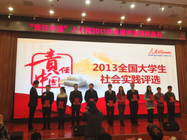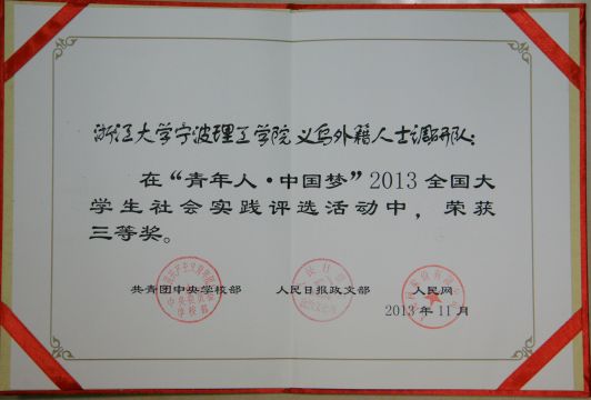 2013年在共青团中央与人民网主办的全国老员工社会实践评选活动中,公司“义乌外籍人士调研队”荣获三等奖。今年寒假期间调研队员工代表郑媛同学赴京参加颁奖典礼,并与来自全国各兄弟院校的获奖团队师生进行了座谈交流。