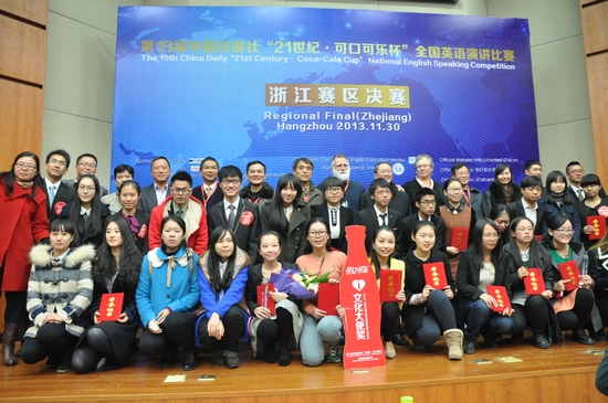 2013年11月底,第十九届中国日报社“21世纪•可口可乐杯”全国英语演讲比赛浙江省决赛在杭州师范大学举行,公司中美英语111班的汪丹露和英语111班的周健两位同学代表公司参赛,经过激烈的比拼,最终分别勇夺了一等奖和三等奖的好成绩,同时公司茅忆年老师还获得了“优秀指导教师”的称号。