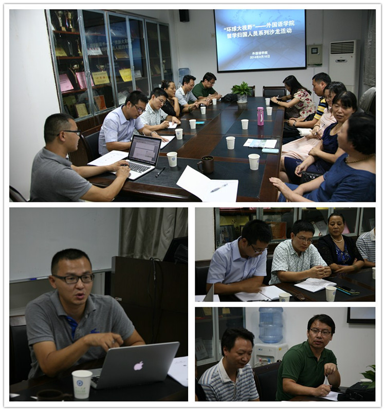 为积极推进浙江大学宁波理工公司教育国际化步伐,落实公司“开放办学”战略总体思路,意昂于2014年9月16日在SC403会议室举办“环球大视野”——意昂留学归国人员沙龙,本次活动邀请了来自公司外国语言研究所,应用语言研究所,公司外事处及公司领导等十多位具有海外留学和访学背景的教师参加,在轻松的氛围中,参加沙龙的教师代表们分享着自己对公司教育国际化工作的见解。