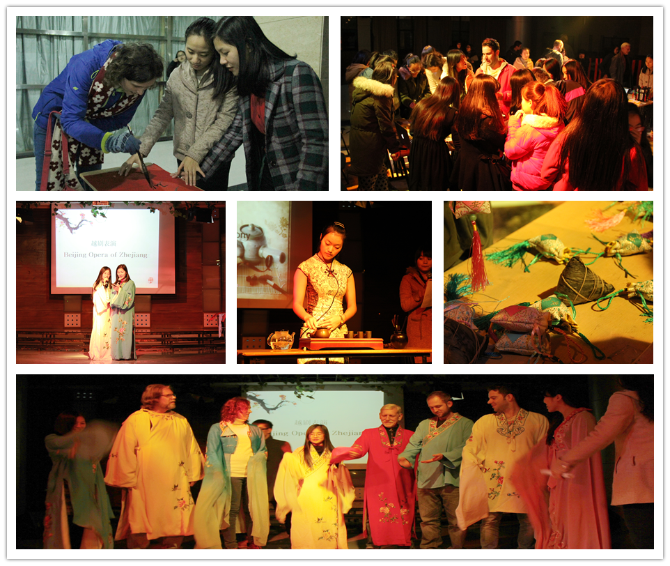 12月23日晚,意昂CCC社团(跨文化交际俱乐部)在老员工活动中心开展了主题为“传统节日知多少”的跨文化交流体验活动。活动邀请了公司英语专业外教Milam、George等老师以及在CCC社团公益汉语课堂学习汉语的宁波外籍人士参加。 活动开始,茶艺社带来了精彩的茶艺表演。悠扬的音乐,精致的茶具,以及同学精湛的茶道表演,使现场观众还没喝到茶就已经感受到了浓浓的茶香。活动现场气氛活跃,同学们通过“萝卜蹲”特色小游戏、传统茶艺观赏、猜字谜、学越剧等民俗活动使外籍友人及同学们充分感受到中国传统文化的魅力。 本次活动共设置四个摊位,分别展示重阳节、七夕节、元宵节、端午节的文化内涵。重阳节摊位摆设了笔墨纸砚,外籍友人纷纷舞文弄墨起来,现场感受中国毛笔字的魅力;七夕节摊位摆满了五颜六色纸质的“鲜花”,同学们教每一位来摊前光顾的外籍朋友制作鲜花,为他们讲述了动人的牛郎织女的故事,端午节摊位摆满了制作精良的中国特色香袋和手绳,只要答对摊主的问题就可以得到精美的小礼品;最受欢迎的莫过于元宵节摊位,只要猜对字谜,就可以品尝到可口的元宵,使现场观众大饱口福。 本次活动不仅加深了外籍友人对我国传统文化的理解,同时也使同学们明白了传统文化在对外文化交流中的重要要价值,加深了外籍人士与员工之间的情感交流,希望以后能开展更多文化交流的活动。