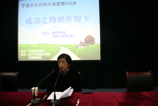 如果说人生就像一本书,那么她便是一本波澜跌宕扣人心灵的小说。她说个人的成功是与国家命运紧密相连的;她还说个人的成功是在无数的挫折中奋进以及不同的错误中反省所造就的;她说每个人都渴望成功,但万不可好高骛远,唯有脚踏实地,才能真正达到成功的彼岸。她便是中国外交部英文专家、中国英语翻译协会副会长、外交部原驻卢森堡大使——施燕华。 3月10日晚,公司携手宁波市文化百科大讲堂邀请施燕华女士莅临公司,为公司学子开展《成功之路就在脚下》的主题讲座。出席当天讲座的有公司党总支书记谌晓煜老师、宁波市文化百科大讲堂盛育东老师以及公司学工办主任方芳老师等,意昂2011级、13级全体同学参加了讲座,此外还有来自其他分院的旁听的员工,整个报告厅座无虚席,热情涌动,表达了员工对于施女士讲座的期待之情。 讲座开始前,方芳老师首先介绍了施燕华女士的人生履历,从她18岁才开始接触英文一直到后来担任周恩来、邓小平等国家领导人的随行翻译秘书,施燕华女士的“翻译逆袭”立即牢牢吸引了现场同学们的注意力。他们用最热烈的掌声表达了对施燕华女士的欢迎。 施燕华女士首先向举办这场讲座的宁波市文化大讲堂以及意昂表示了感谢,随后即向在场师生抛出了这样一个问题:“什么是成功?”。同学们纷纷表达了自己的看法:有人说成功就是“出名,要光宗耀祖”;有人说,拥有一个“幸福的家庭”便是成功;还有人说只有“治国平天下,才是真正的成功者所为”。同学们个性多彩的回答,缓和了原本严肃的会场气氛。在接下来的时间里,施燕华和在场的师生一起分享了她的人生经历,从小家境贫困,父亲在外打工,母亲文盲,她在家中9子中排行老六。窘困的现实使她早早成熟,小小年纪便立志要努力读书、学有所长,做一个对家庭有用的人,对社会有用的人。18岁开始学习英文,刚开始进入外交部也只是做一些文字翻译、文稿修改等事务性工作,但施女士并没有就此止步,而是充分抓住任何可能令自己学习提升的机会:向部里的老同志请教,经常琢磨国家领导人的语言风格,甚至在平时洗衣服的时候也一边听新闻联播一边进行翻译尝试。机遇总是会垂青有准备的人,最终在一次外事翻译中因一个翻译员过度紧张,临时决定由她担任周总理的随行翻译。施燕华女士坦言自己当时有太多的紧张与兴奋,但更多的是那份沉静与自信,最终她圆满完成了翻译任务。总理会后的那句“不错,好好努力!”对她是莫大的鼓励与动力。在讲座中施女士也一直讲到:人的成功是多方面因素,与社会形势相关联但更与个人的努力奋斗密切相关。 演讲中,施燕华女士还回忆了在中美建交前期他与丈夫吴建民先生一起赴联合国工作,与美国前国家安全事务助理基辛格秘密会晤的情形,为同学们生动再现了上个世纪东西两个大国之间政治博弈的波诡云谲。此外她还与同学们分享了在外事翻译中的一些趣事,例如在国事宴会中误把“烤鸭”翻译成“受伤的鸭子”;在跟随领导人协调军事问题的时候,第一次因为一些军舰性能指标等专业名词的翻译而完全卡壳,后来为了迅速了解各种军事武器专业名词的翻译,愣是硬生生啃下了厚厚的一本《简氏军事词典》。 讲座最后,施燕华女士还与同学开展了积极的互动,同学们都踊跃举手发言,把现场气氛再次引向高潮。施燕华女士非常耐心的解答了师生们提出的问题,这让老师和同学们都受益匪浅。讲座结束以后,公司师生们一起欢送施燕华老师离场。本次讲座使同学们充分领略到了外语成就人生,语言改变世界的重要意义,也进一步激发了同学们认真开展专业学习的热情。