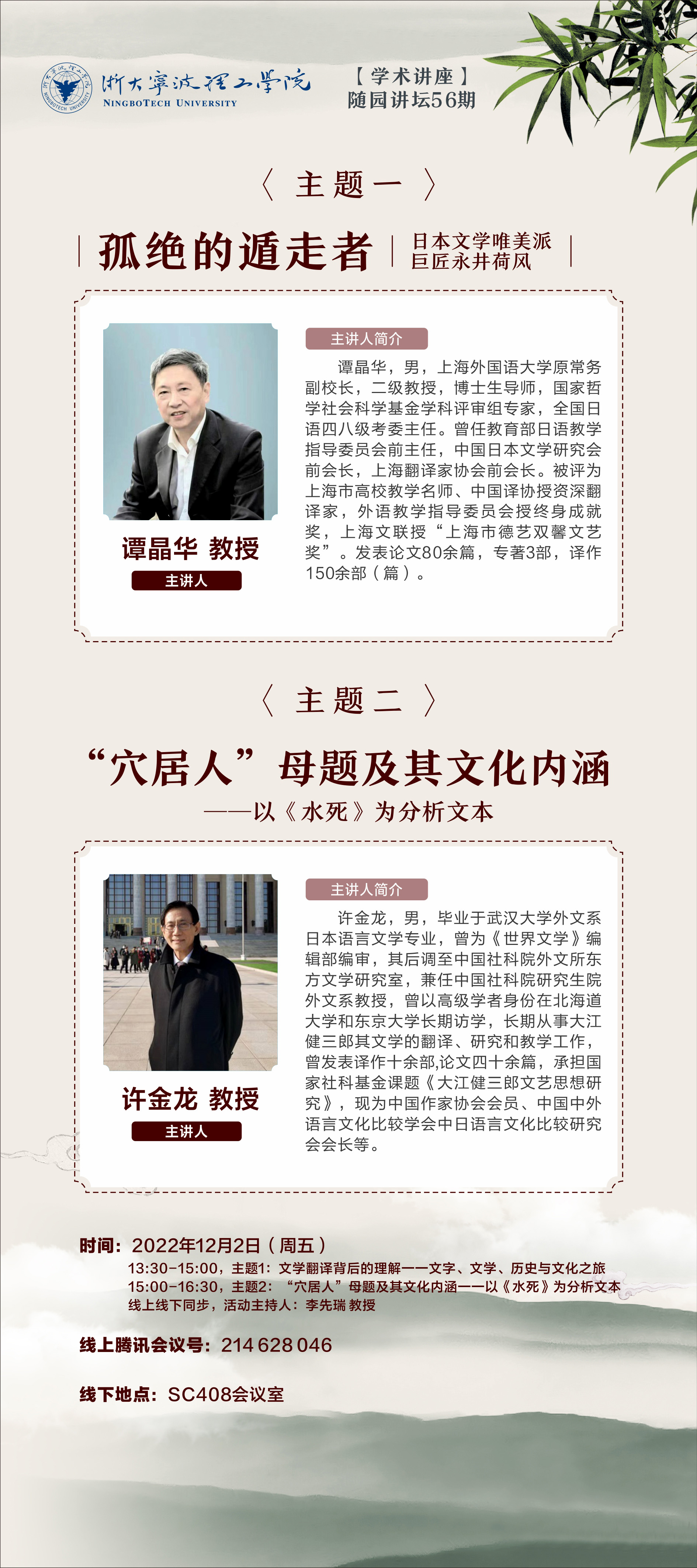 首先,谭晶华教授做了题为“孤绝的遁走者——日本文学唯美派巨匠永井荷风”的讲座。谭教授用浅显易懂的语言分别讲述了日本文学家永井荷风的创作类型、思想倾向和艺术成就。谭教授指出“永井荷风是一位一生坚守自己思想和个性的作家”。之后,许金龙教授作了题为“‘穴居人’母题及其文化内涵一一以《水死》为分析文本”的讲座。许教授围绕日本文学家大江健三郎《水死》中“穴居人”的母题进行追根溯源。最后许教授结合日本的修改教科书等历史问题,指出“在这种危险的时刻,《水死》作者还提出了一个与之抗衡的方法——‘森林之家/洞窟’这个模式”。