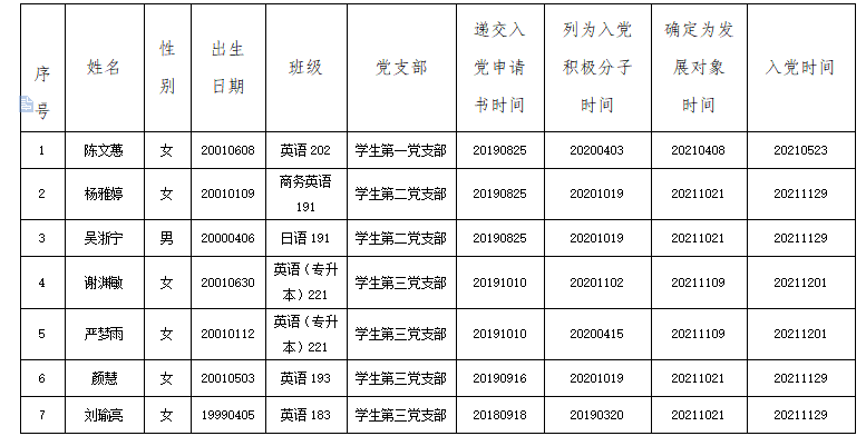 根据陈文蕙等7名同志的现实表现和党组织的培养考察,经本人申请、支委会审查,拟将陈文蕙等7名同志按期转为正式党员。为进一步增强发展党员工作的透明度,接受党内外群众的监督,确保发展新党员的质量,现予以公示。在公示期限内,欢迎广大师生通过信函、电话或直接反映问题。以个人名义信函反映提倡署真实姓名。公示7天,时间自2022年11月21日至2022年11月27日。
