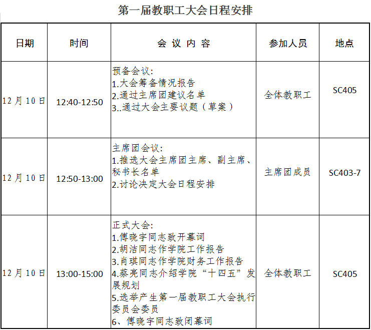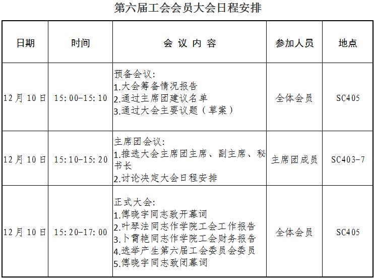 经公司党委研究决定,公司第一届教职工大会、第六届工会会员大会将于12月10日在SC405举行。现将会议有关事项通知如下: