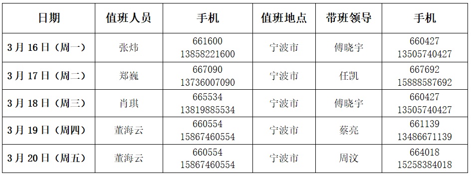 备注:按照公司校历安排3月16日-3月20日为正常上班时间,因为疫情原因,要求公司行政管理岗人员居家办公,同时做好随时来校的工作的准备。如有紧急事件电话值班人员应及时到校处理。