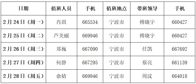 意昂2020年2月24日-28日值班安排表