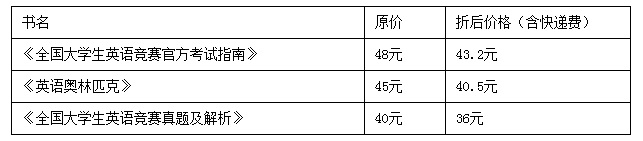 各院校员工可在竞赛网上报名的同时,自行选择是否购买《全国老员工英语竞赛官方考试指南》(2019版,48元/本)及全国竞赛组委会指定辅导用书:2018年新版《英语奥林匹克》丛书(45元/本)和《全国老员工英语竞赛真题及解析》(40元/本)。以上竞赛辅导用书均按竞赛四个类别编写,分A、B、C、D四个分卷(册),供四个类别的参赛员工使用。竞赛辅导用书预计2018年12月上市,我省今年统一网购书价是原价的9折(含省内邮寄费),将统一快递邮寄到员工本人,请员工报名时务必详细写明邮寄地址。辅导用书预计在2019年1月发行和邮寄,希订购时具体邮寄地址考虑清楚。(建议填写寒假地址)