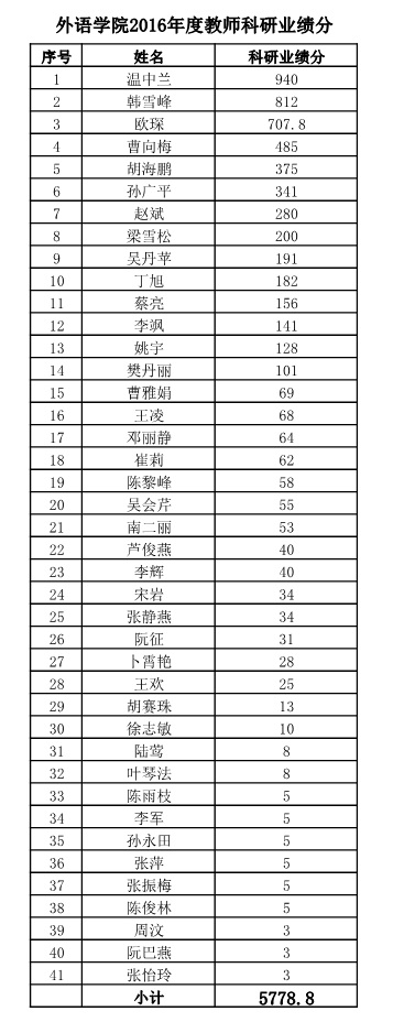 外语公司2016年度科研业绩分已计算完成,之前公示期于1月6日截止,该表格于1月9日上报公司科研处。