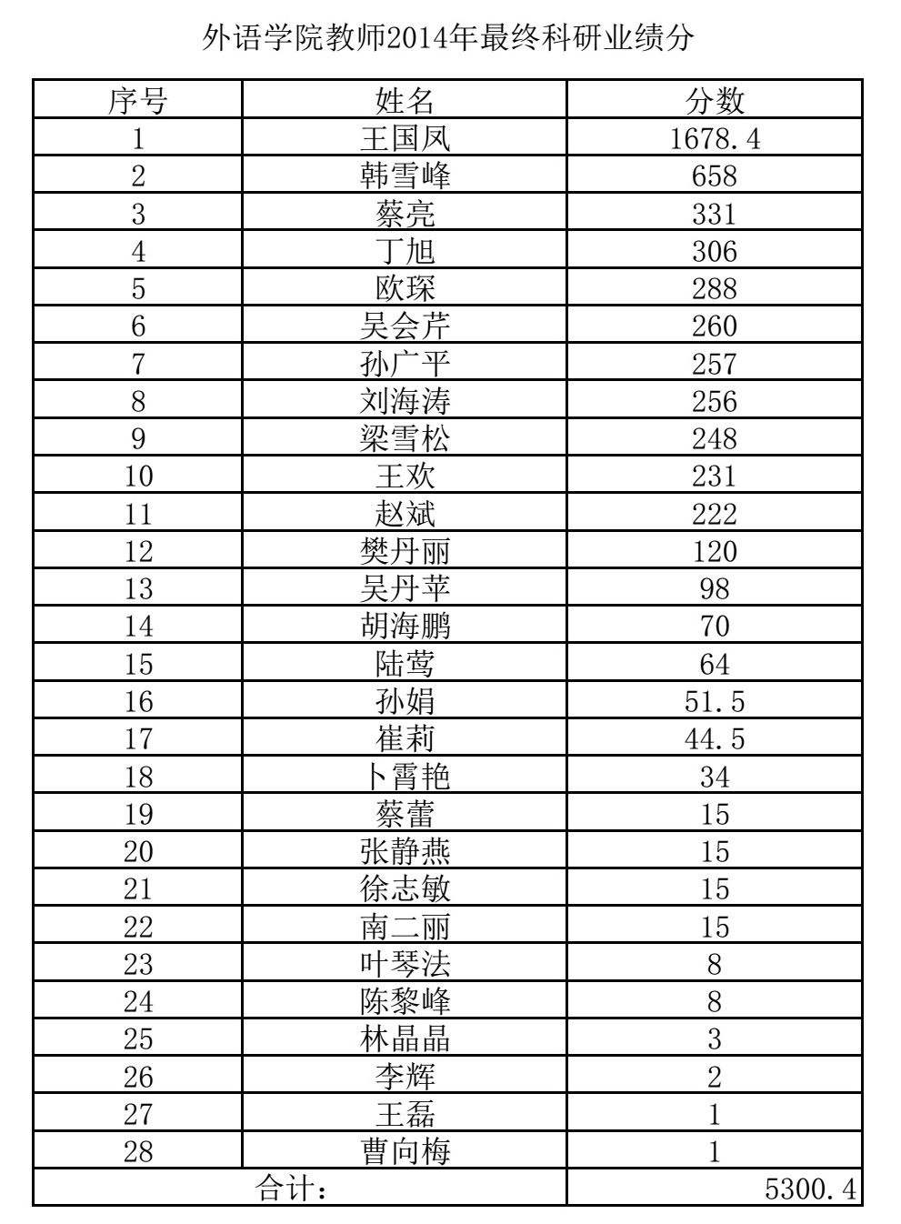 外语公司2014年度科研业绩分已计算完成,公示期于1月14日截止,如无异议,该表格将于1月14日上报公司科研处。